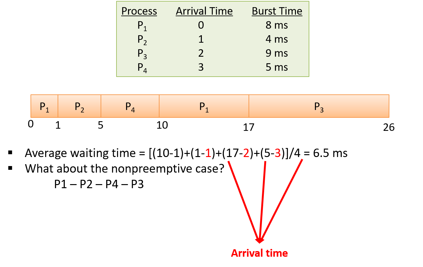 - 만약 preemtive상태일 때, 새로운 프로세스가 ready 큐로 들어오고, 현재 프로세스의 길이보다 짧다면 현재 프로세스를 preempt 한다.