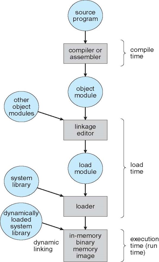 - Execution time: 만약 프로세스가 실행되는 동안 한 개의 메모리 구역에서 다른 구역으로 옮겨갈 수 있다면, 바인딩은 런타임까지 늦춰진다.