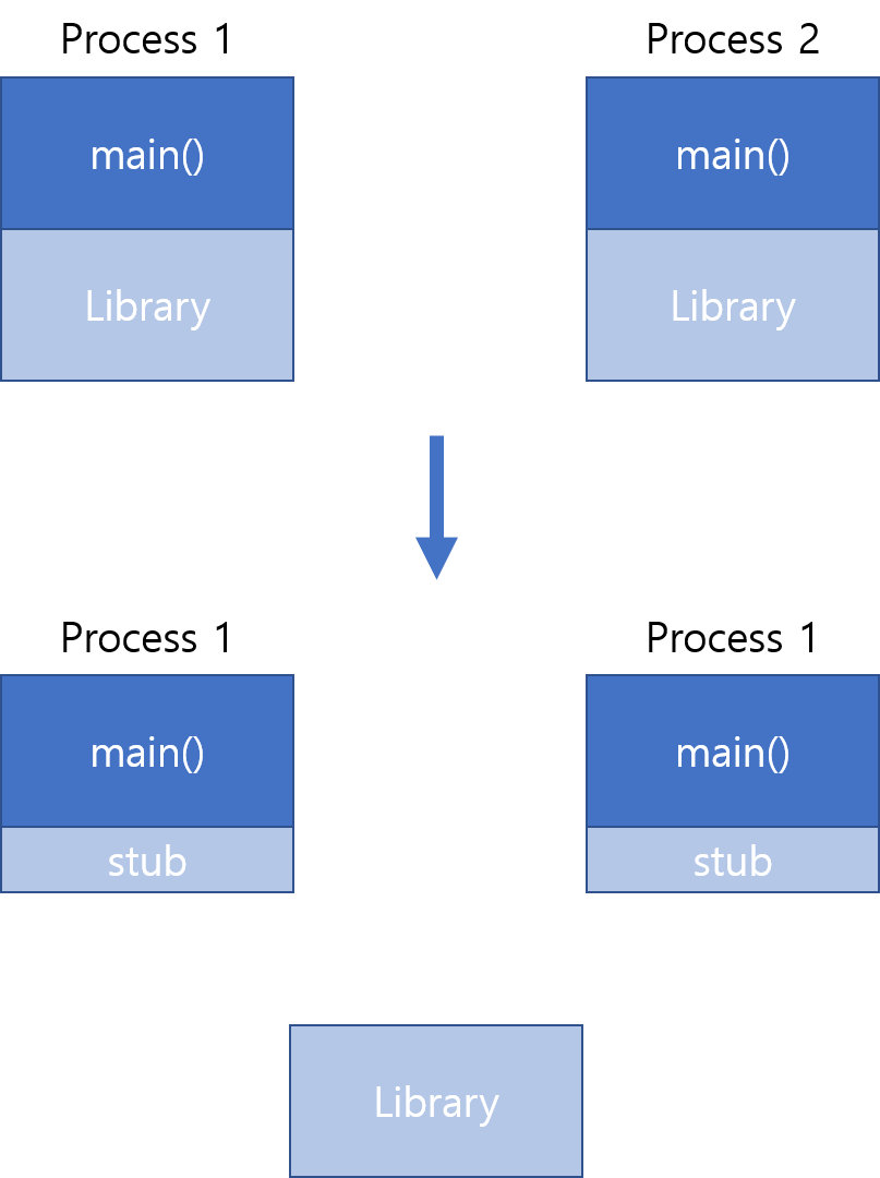 - 프로그램 내에서 라이브러리를 호출하는 곳마다 stub이라는 작은 코드 조각이 생성된다.