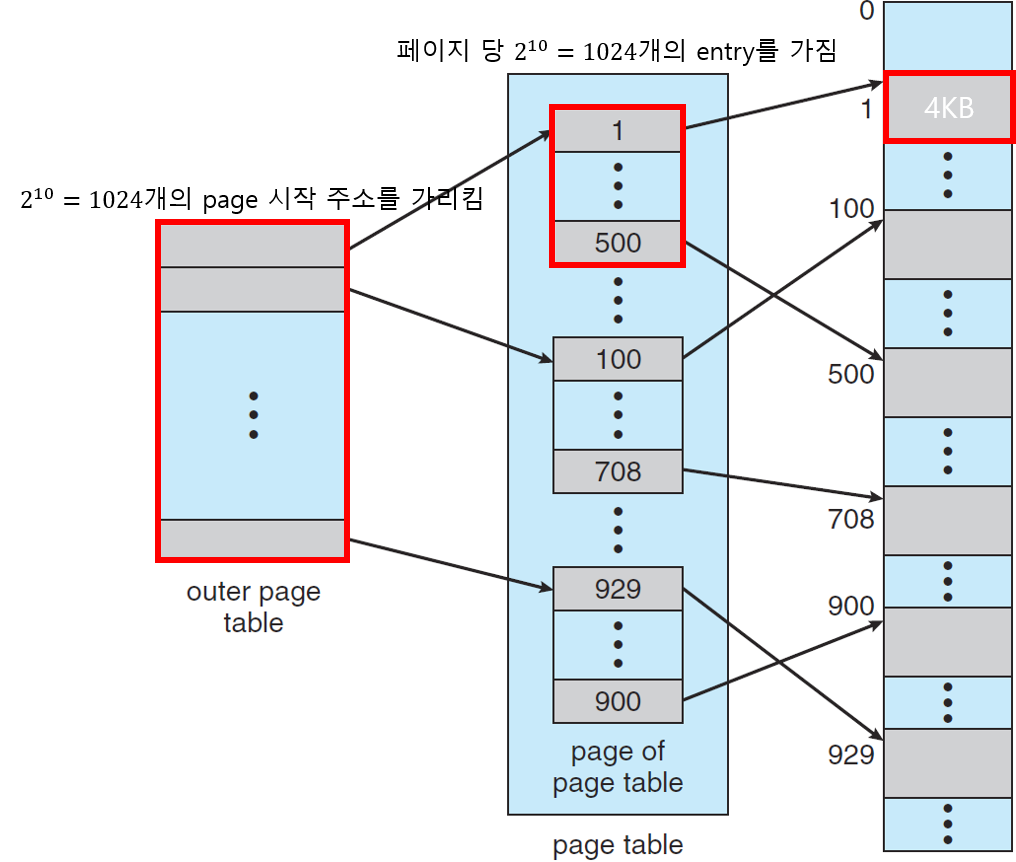 Page of page table이 1K(= 2^10)개가 존재하므로 outer page table의 엔트리는 이와 동일하게 1K(= 2^10)개가 필요하고, 엔트리 한 개는 page of page table의 주소를 가리키므로 크기는 4KB(= 2^12)가 된다. 이는 페이지 1개의 크기와 동일하므로 더 이상 페이징으로 나눌 필요가 없게 된다.