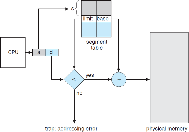 CPU는 논리적 주소인 s와 d를 생성하는데, s는 segment id, d는 offset을 의미한다. 세그먼트는 세그먼트 테이블을 통해 실제 물리 메모리의 주소로 매핑된다.