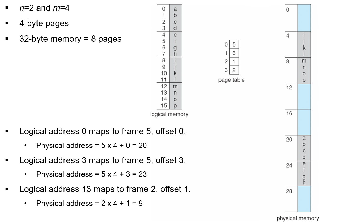 CPU는 논리적 주소인 p와 d를 생성하는데, p는 page number, d는 page offset을 의미한다. 페이지의 크기는 하드웨어에 의해서 결정되는데, 주로 2의 지수형태이다. 페이지는 페이지 테이블을 통해 실제 물리 메모리의 주소로 매핑된다.
