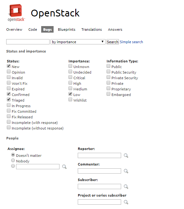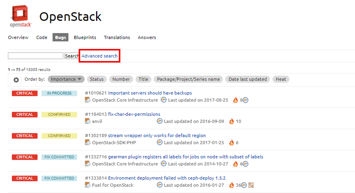 Bugs 섹션에서 위와 같이 현재 OpenStack 내에서 보고된 모든 이슈와 버그들을 확인할 수 있습니다. 왼쪽에 CRITICAL과 IN PROGRESS, CONFIRMED와 같은 정보를 확인하실 수 있는데요, 이와 같은 정보는 여기를 참고해주세요. 우리는 여기서 우리가 해결할 수 있는 쉬운 버그를 찾아야 합니다. 위에서 Advanced search를 클릭해주세요.