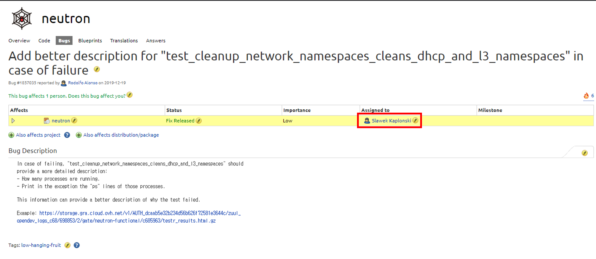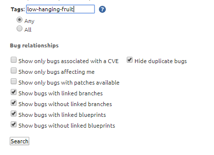 이 부분이 정말 중요합니다. Tags에 low-hanging-fruit를 입력해주세요. 이 태그는 저희와 같이 OpenStack에 처음 contribute를 하는 사람들을 위한 태그입니다. 이 태그를 통해 해당 버그나 이슈가 해결하기 쉽다는 것을 초보 기여자들에게 알리고, 그와 동시에 진입장벽을 낮춰 OpenStack에 기여를 할 수 있도록 장려하는 태그입니다.
