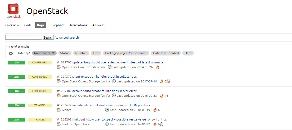먼저, OpenStack의 이슈나 버그들은 현재 대부분 Launchpad를 통해서 보고됩니다. OpenStack에는 매우 많은 프로젝트가 존재하는데요, 여기서 본인이 기여하고자 하는 프로젝트만 고르셔도 되지만, 저는 모든 프로젝트에 대해서 찾아보겠습니다.