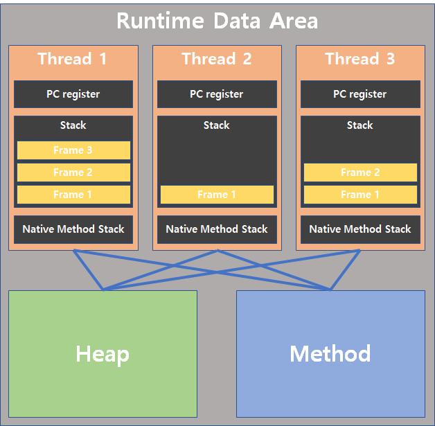 - 메소드 하나가 실행되면서, Stack과 Heap에 필요한 정보를 저장한다. (예: 변수, 동적 할당)