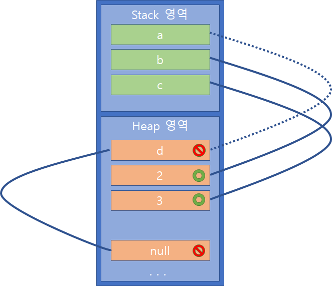 - Heap 영역에 있는 객체를 가리키는 레퍼런스 변수가 Stack에 저장된다.