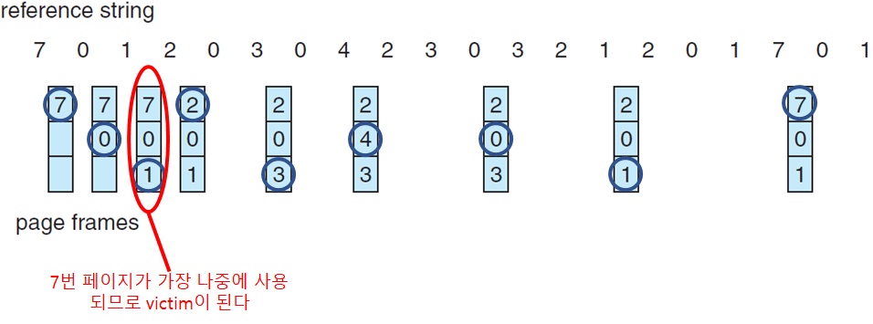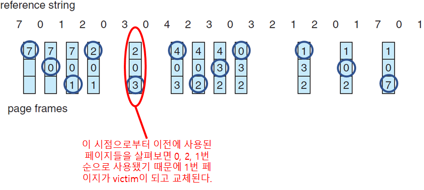 Optimal 페이지 교체가 실제로 구현하기 어렵기 때문에 우리는 Optimal 페이지 교체 알고리즘의 Approximation을 사용한다. 과거의 정보를 사용하여 미래의 대한 정보를 추정한다. 즉, LRU 페이지 교체는 최근에 사용한 페이지 중에서 가장 오래된 페이지를 victim으로 선택하는 방법이다.