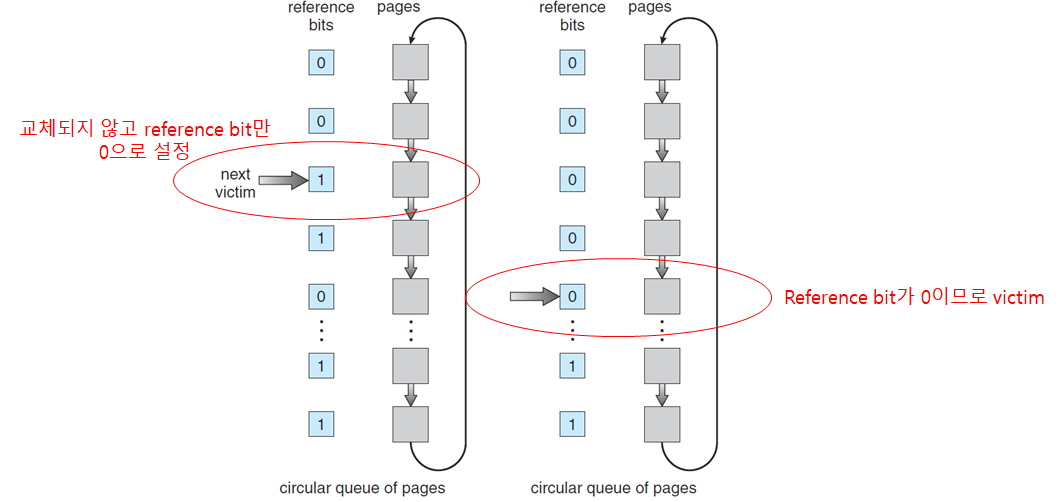 - 두 번째 순회에서 victim 페이지를 찾지 못했다면 페이지의 상태는 모두 (0, 0) 또는 (0, 1)만 남게된다. 그럼 다시 상태가 (0, 0)인 페이지를 찾아서 교체한다.