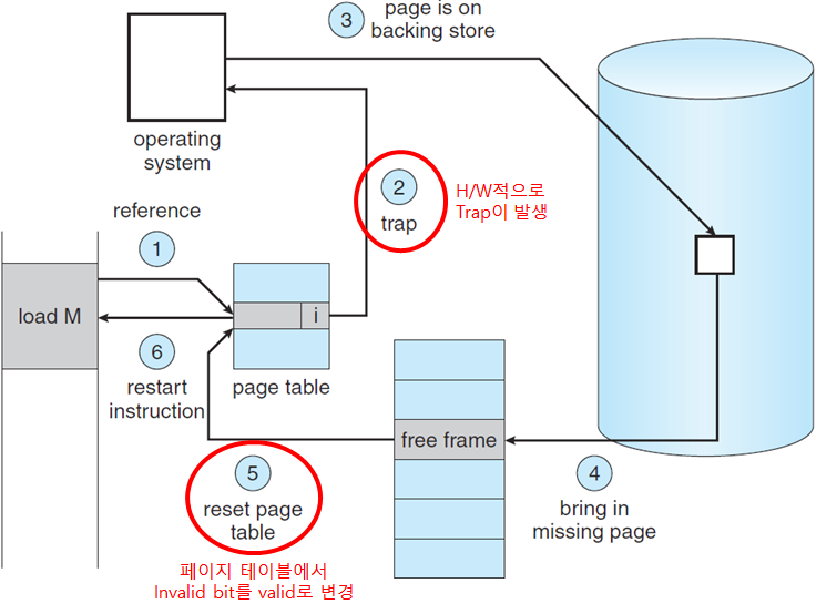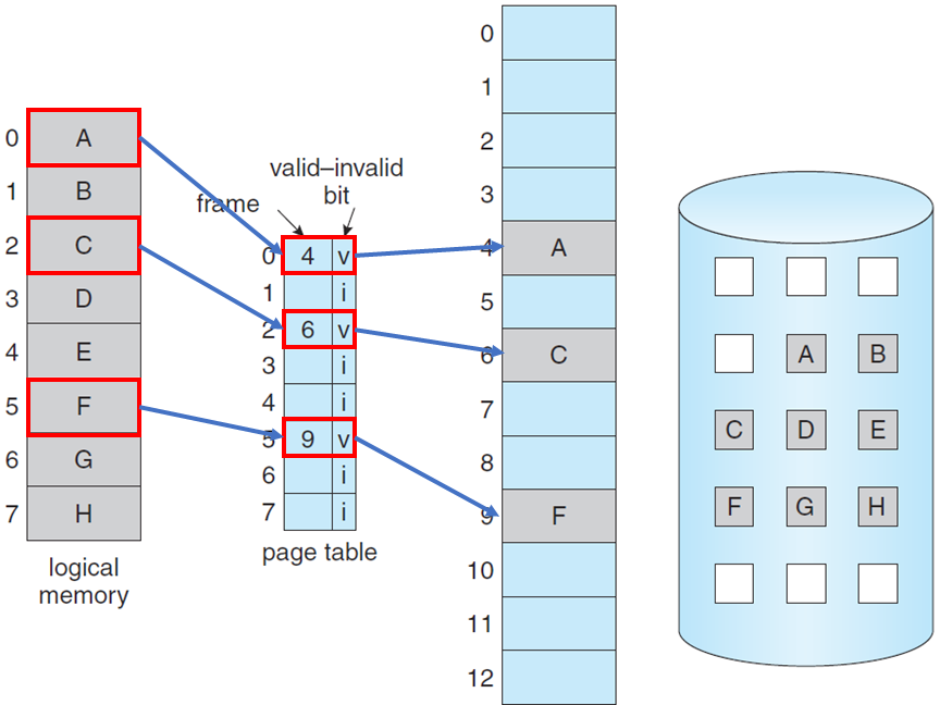 위의 그림에서 프로세스는 A~H를 다 쓴다고 생각하지만, 실제로 메모리에는 A, C, F만 로드되어 있다. 이때 페이지 테이블에 존재하지 않는 페이지에 프로세스가 접근하게 된다면 디스크에서 해당하는 페이지를 메모리로 로드하고, 페이지 테이블을 업데이트한다.