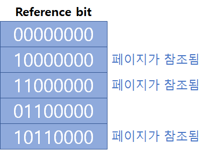Additional-Reference-Bits 알고리즘은 페이지 테이블의 페이지마다 8비트의 reference bit를 가지며, 특정 시간 간격마다 reference bit의 값을 기록한다. Reference bit의 값을 기록할 때는 기존의 값을 right shift 하고, MSB에 reference bit의 값을 기록한다. 이 비트값을 사용하여 페이지를 사용한 시간으로 해석할 수 있으며, 비트값이 가장 작은 페이지가 victim이 된다. 하지만 단점으로는 가장 작은 비트값이 두 개 이상 존재할 수도 있다.