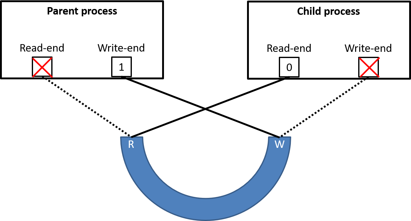 - fd[0]: read-end, fd[1]: write-end