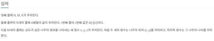 1 2 3 4 5 6 7 8 9 10 11 12 13 14 15 16 17 18 19 20 21 22 23 24 25 26 27 28 29 30 31 32 33 34 35 36 37 38 39 40 41 42 43 44 45 46 47 48 49 50 51 52 53 54 55 56 | import sys inputLine = sys.stdin.readline().split() n, m, k = int(inputLine[0]), int(inputLine[1]), int(inputLine[2]) field = [[5 for r in range(n + 1)] for c in range(n + 1)] trees = [[list() for r in range(n + 1)] for c in range(n + 1)] A = [[0 for r in range(n + 1)] for c in range(n + 1)] for r in range(1, n + 1): inputLine = sys.stdin.readline().split() for c in range(1, n + 1): A[r][c] = int(inputLine[c - 1]) for i in range(m): r, c, age = list(map(int, sys.stdin.readline().split())) trees[r][c].append(age) dr = (-1, -1, 0, 1, 1, 1, 0, -1) dc = (0, 1, 1, 1, 0, -1, -1, -1) for year in range(k): dead_trees = list() # spring & summer for r in range(1, n + 1): for c in range(1, n + 1): temp = 0 for i in range(len(trees[r][c]) - 1, -1, -1): if field[r][c] >= trees[r][c][i]: field[r][c] -= trees[r][c][i] trees[r][c][i] += 1 else: temp += trees[r][c][i] // 2 trees[r][c].pop(i) field[r][c] += temp # autumn for r in range(1, n + 1): for c in range(1, n + 1): for i, age in enumerate(trees[r][c]): if age % 5 == 0: # for all directions for direction in range(8): new_r = r + dr[direction] new_c = c + dc[direction] if 1 <= new_r <= n and 1 <= new_c <= n: trees[new_r][new_c].append(1) # winter field[r][c] += A[r][c] count = 0 for r in range(1, n + 1): for c in range(1, n + 1): count += len(trees[r][c]) print(count) | cs |