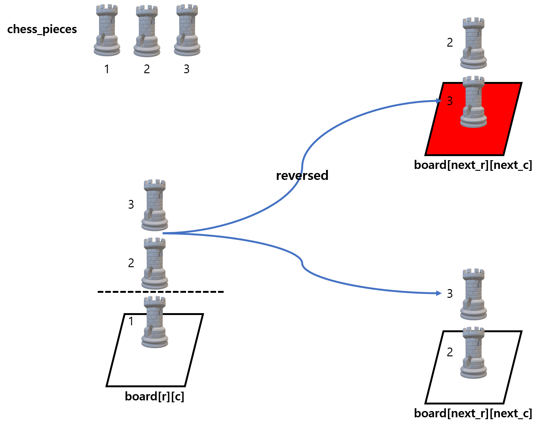 - 만약 다음에 이동할 칸이 빨간색이라면 체스말들의 순서를 뒤집어서 옮기고, 체스말들의 위치를 업데이트한다. (68~73번째 줄)