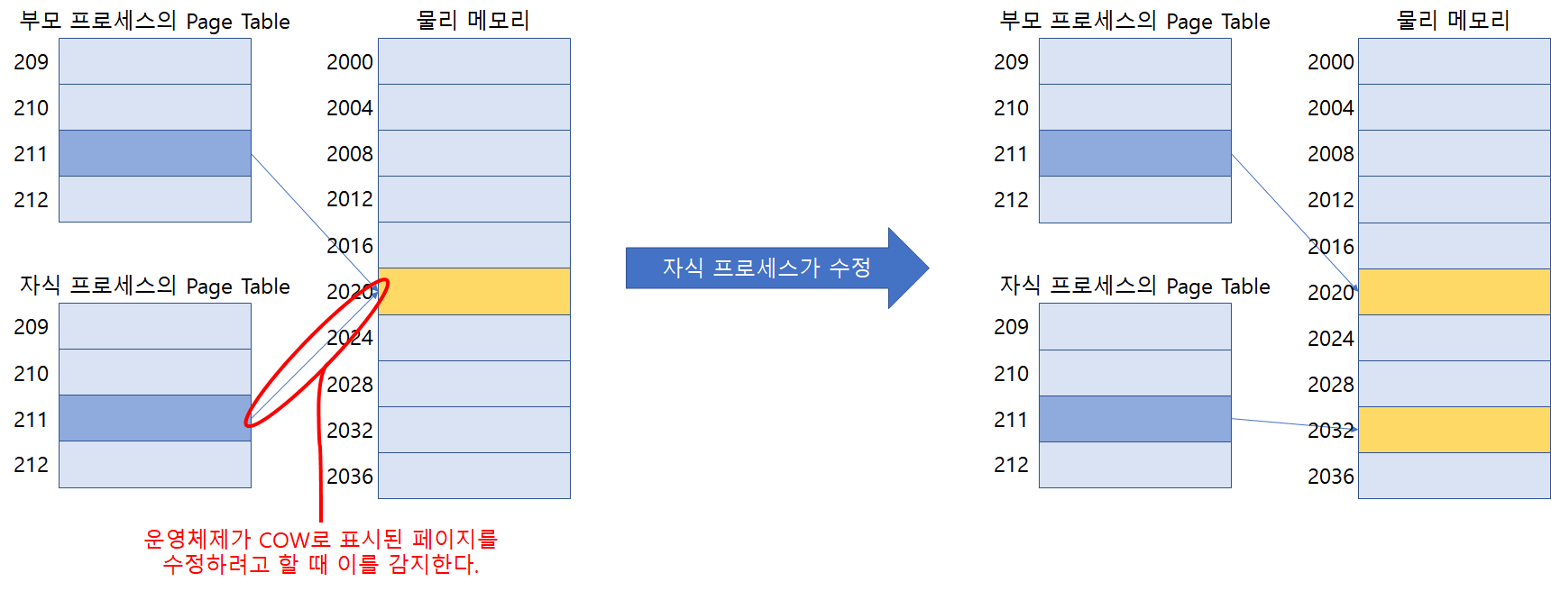 COW(Copy-on-Write)는 이러한 페이지의 불필요한 중복을 줄이는 방법이다. fork()를 통해 부모 프로세스가 소유하고 있던 메모리 영역은 모두 'copy-on-write'로 표시가 된다. 만약 자식 프로세스가 공유된 부모 프로세스의 페이지들 중 어떤 페이지라도 수정을 한다면 그때 페이지를 복사하여 수정한 후, 수정된 페이지를 메모리에 따로 저장한다.