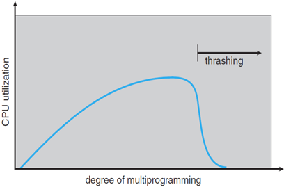 - Page Fault가 증가함에따라 디스크 I/O 작업이 증가하기 때문에 CPU utilization이 감소한다.